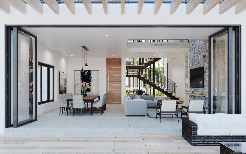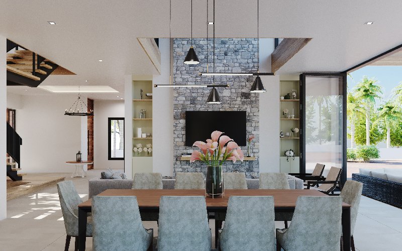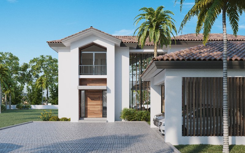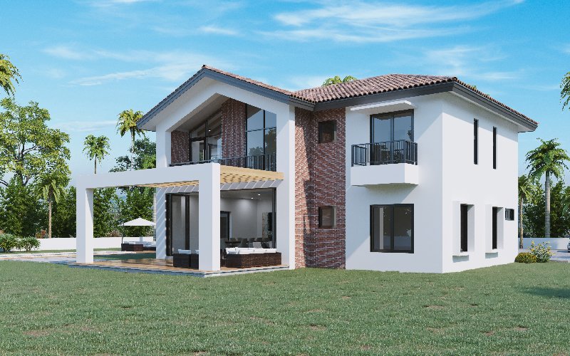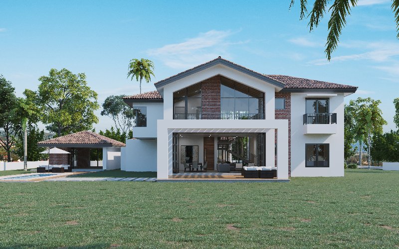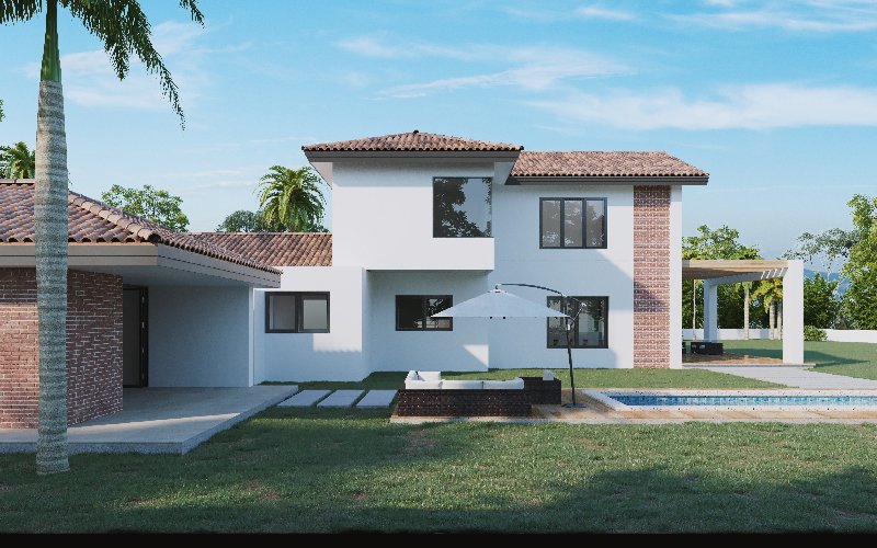 La posición de la casa se integra a su entorno, aprovechando al máximo las vistas, ventilación e iluminación natural; para ello, las estancias como sala-comedor, terraza y balcones se abren hacia el patio y piscina.