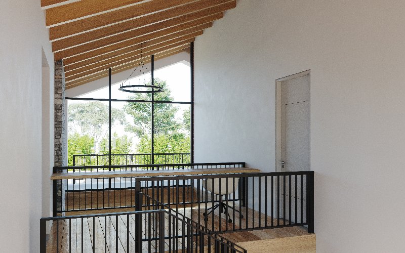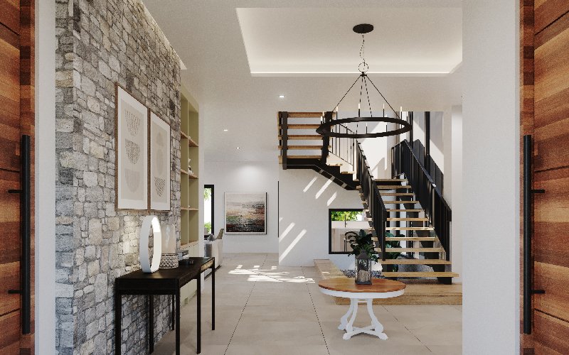 En esta casa de dos plantas se combina perfectamente los gustos, deseos y aficiones de una pareja joven que busca construir un proyecto de vida, un hogar cálido y cómodo para su familia. La propuesta es de un estilo tipo cabaña con toques modernos y elegantes, reflejados en el uso de enchapes de piedras naturales y fachaleta de barro, amplios ventanales y vigas de madera con efectos de luz artificial en cielo falso y muebles, todo ello en contraposición con paredes de colores claros y totalmente lisas.